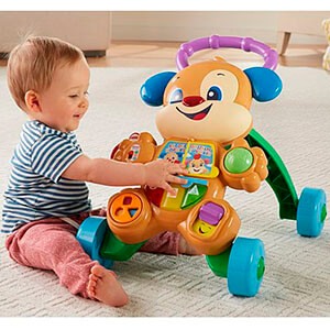 Vamos dar um passeio, bebê! O Cachorrinho é o amigo perfeito para seu filho, oferecendo atividades práticas para brincar sentado, além de muitas frases de incentivo e apoio para dar aqueles importantes primeiros passos. Conforme os pequenos vão crescendo, o Cachorrinho ensina sobre o alfabeto, formas, cores, contagem e até palavras em inglês! Onde o desenvolvimento encontra a brincadeira. Aprendizado: Canções e frases divertidas ensinam o alfabeto para o bebê, além de cores, números, palavras em inglês e muito mais! Coordenação motora: Os músculos são exercitados quando crianças sentadas interagem com as atividades, e depois levantam para andar. Curiosidade e descoberta: Conforme os bebês descobrem como ativar músicas e frases apertando os botões ou empurrando o andador, aprendem que suas ações fazem com que as coisas aconteçam. Isso é causa e efeito!